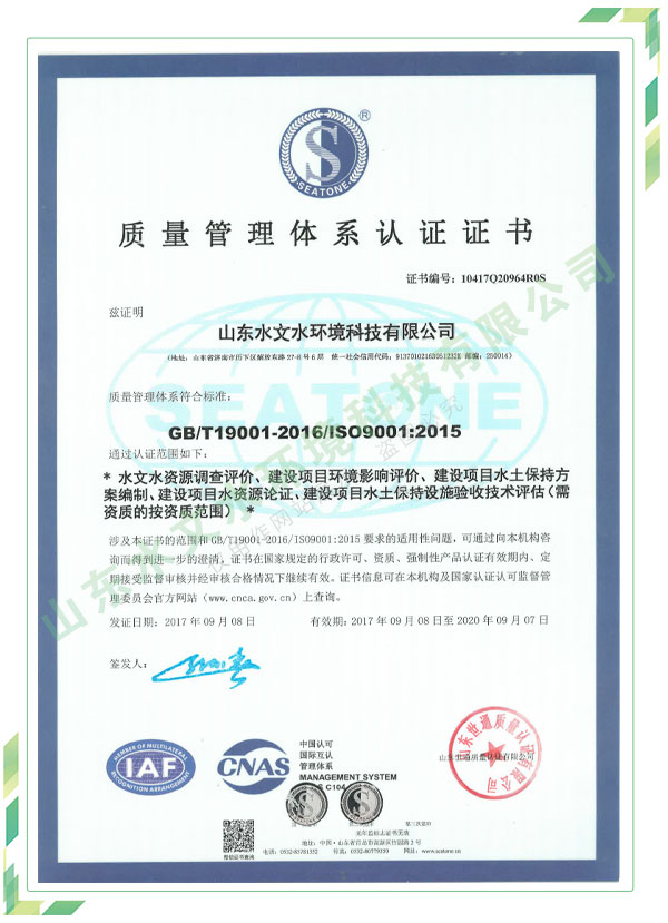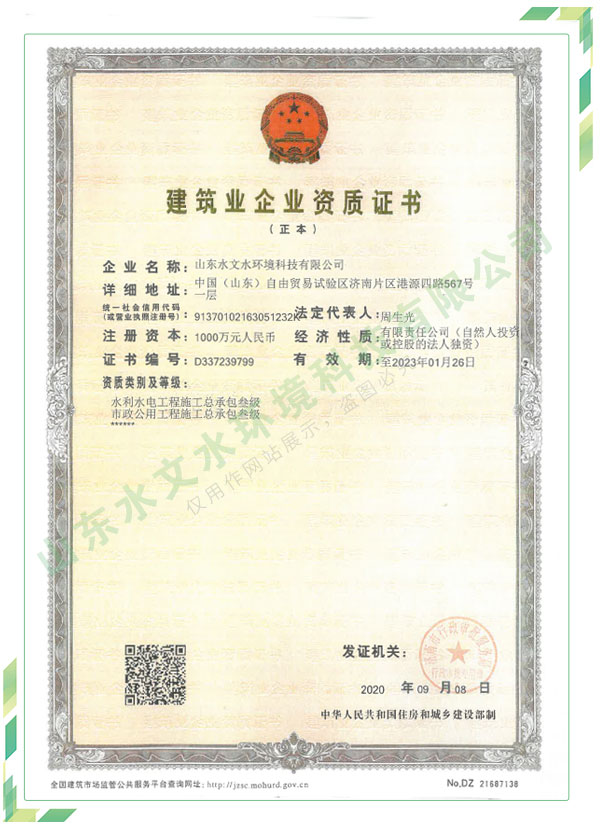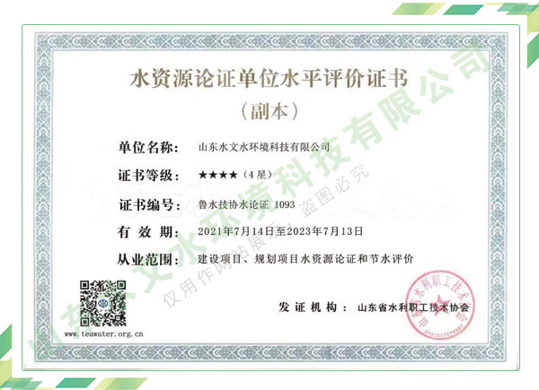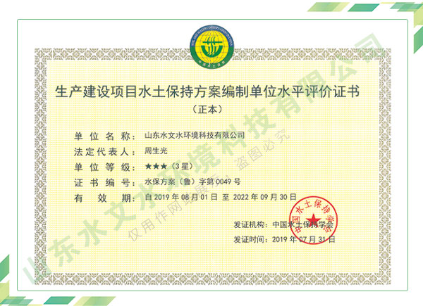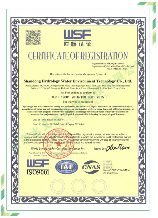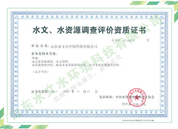 公司擁有水利工程設計、水土保持、水文水資源調查評價、水資源論證、建設項目環(huán)境影響評價、市政公用工程施工總承包、水利水電工程施工總承包、電子與智能化工程專業(yè)承包等資質,2017年通過質量管理體系、環(huán)境管理體系、職業(yè)健康安全管理體系認證;2020年被評為國家級高新技術企業(yè),同年被中國水利企業(yè)協(xié)會推薦為第一批“合同節(jié)水服務企業(yè)”;2021年被山東省、濟南市評為 “專精特新”中小企業(yè)。業(yè)務范圍涉及水利工程設計;節(jié)水設計、改造、水平衡測試;山洪災害調查;城市水資源調查評價;建設項目水土保持方案編制、監(jiān)測、驗收、水土保持規(guī)劃;水安全保障規(guī)劃、建設項目水資源論證、規(guī)劃水資源論證;建設項目環(huán)境影響評價;入河排污口論證;防洪影響評價;市政公用工程施工、水利水電工程施工、電子與智能化工程施工等。